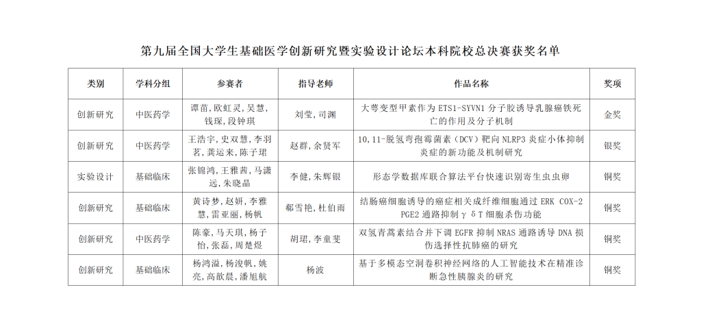 本次论坛由高等公司国家级实验教学示范中心联席会基础医学组、高等公司基础医学创新创业协同育人工作组主办,分为基础临床、法医学、预防医学、中医药学、口腔医学等五个学科赛道,是目前全国基础医学教育领域影响力最大的老员工创新设计展示活动和基础医学学科竞赛。为保证竞赛作品质量,在教务处统筹、指导下,7790必发集团精心组织,邀请了多名优秀导师作为专家,严格按照竞赛通知要求,认真遴选竞赛项目和团队,推荐30支队伍参加比赛,最终取得优异成绩,获奖数量和质量均突破新高,在中南赛区复赛中荣获一等奖3项,二等奖3项,三等奖9项,优秀奖4项。最终经过层层选拔,公司6支队伍凭着出色的表现成功站到总决赛的舞台,斩获金奖1项、银奖1项、铜奖4项。