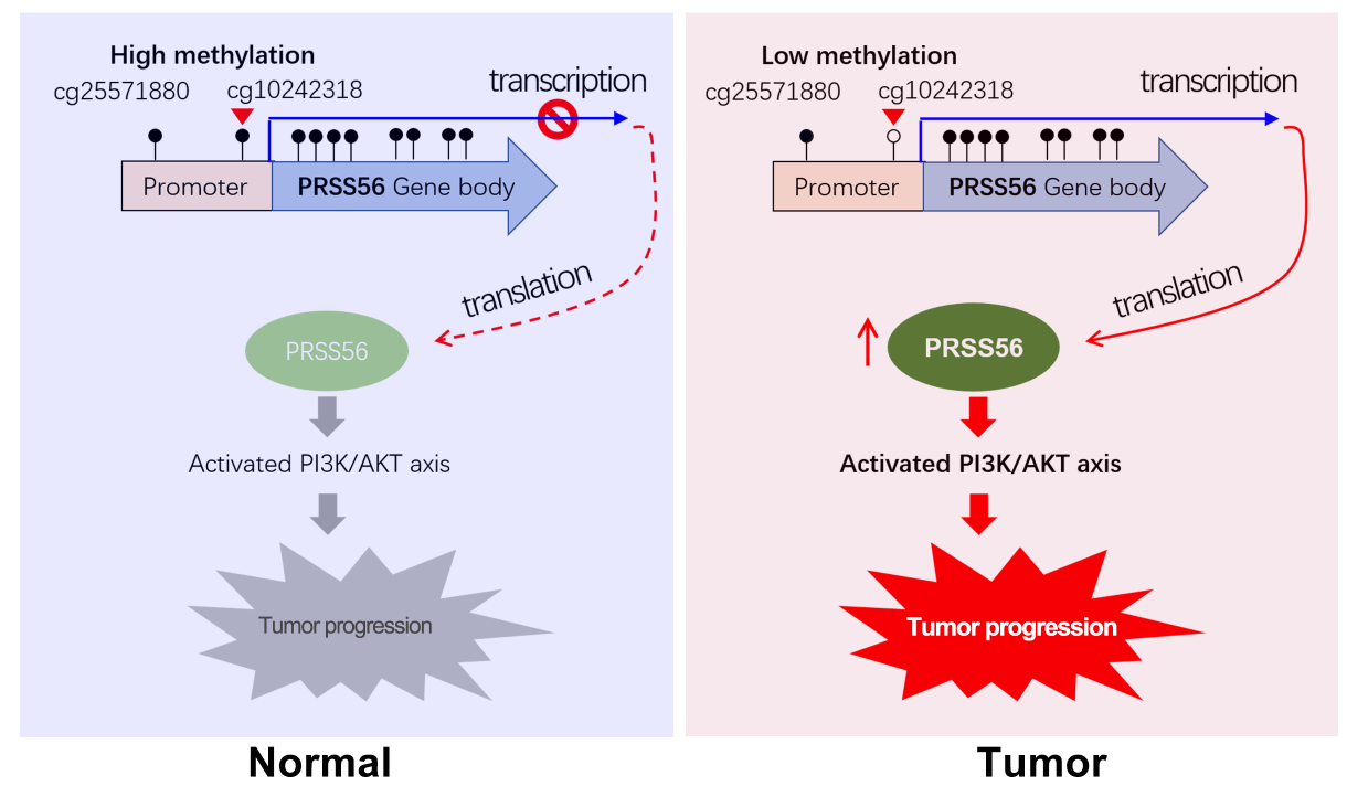 在这项研究中,基于“DNA低甲基化可导致CTA基因表达异常激活”这一重要特征,钦闪闪团队开发了一套“基于多组学数据高通量筛选鉴定癌睾抗原”的新方法,并在胃癌中验证了该方法的可行性。研究结果表明,丝氨酸蛋白酶PRSS56是一个新的癌睾抗原。由于启动子DNA的低甲基化,PRSS56基因在包括胃肠系统肿瘤在内的多种癌症中过表达,并表现出免疫原性。功能实验证实PRSS56过表达可通过激活PI3K/AKT轴在胃癌和结直肠中发挥致癌作用。