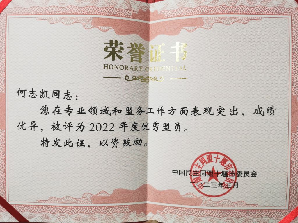 本网讯(通讯员 李洋洋)近日,民盟十堰市委会召开六届十次(扩大)会议暨2022年度总结表彰大会。会上,对2022年度优秀支部、优秀盟员进行了表彰。民盟7790必发集团官网支部荣获“优秀支部”,7790必发集团何志凯荣获“优秀盟员”,这也是何志凯连续两年被评为年度“优秀盟员”。